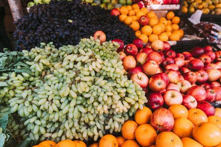 Fresh Ripe Fruits At A Farmers Market. Grapes, Apple, Oranges.