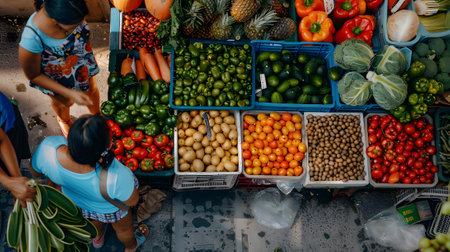 A bustling farmers market, shot from a high angle, emphasizing the variety and abundance of fresh produce, ultrarealistic photo --ar 3:2 --raw --profile nk3i4wf --stylize 250 --v 7 Job ID: c075a0c9-3b8f-4e87-8fc0-a1bbb274e733