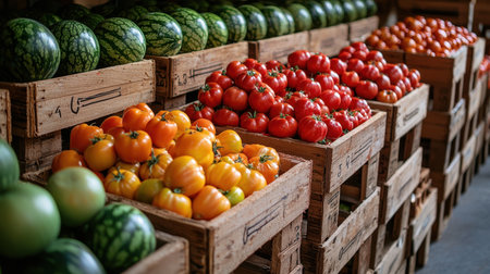 Vibrant heirloom tomatoes and ripe watermelons nestled in weathered wooden bins evoke a rustic market ambiance, perfect for healthy lifestyle themes.