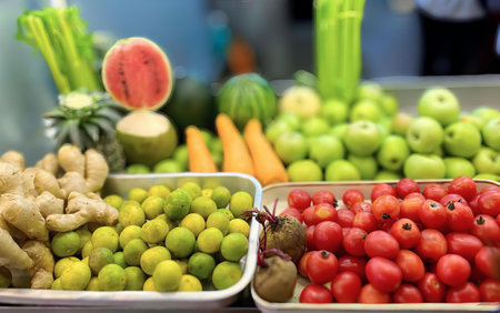 Outdoor fruit stall with fresh juice and ripe produce at local street market