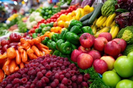 Colorful assortment of fresh produce showcases apples, peppers, bananas, and other vegetables at a lively market.