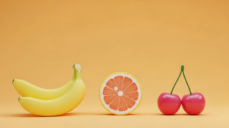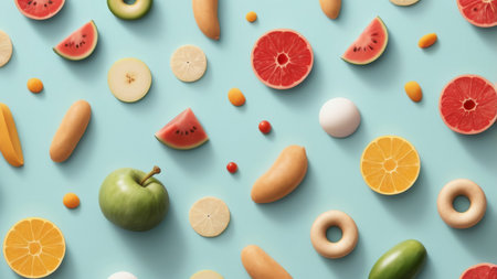 A playful composition of colorful fruits including strawberries, oranges, and grapes floating against a pastel background.