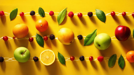 Colorful fruits are creatively arranged in a spiral formation against a vibrant yellow background, evoking a sense of freshness and vitality.