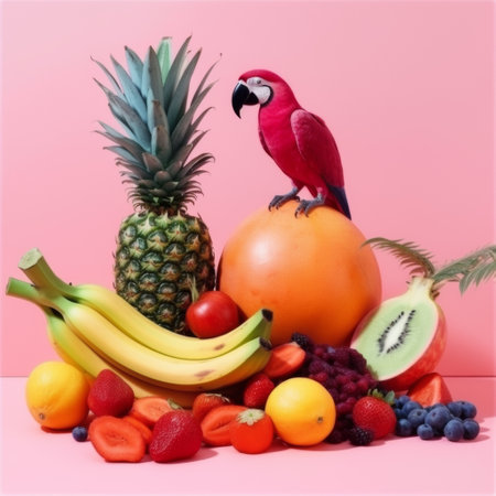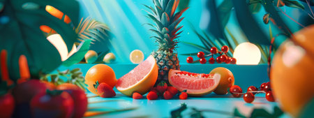 A bright and lively arrangement of tropical fruits, including pineapple and citrus, set against a backdrop of lush green foliage. The vibrant lighting enhances the freshness and natural appeal, perfect for themes related to exotic fruits, summer, and healthy eating.