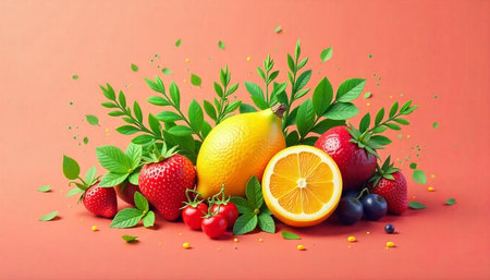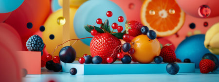 A vibrant assortment of fresh berries and citrus fruits including strawberries, blueberries, and oranges, artfully arranged on a colorful backdrop. The image exudes freshness and energy, ideal for food or healthy eating themes.