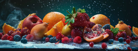 A vibrant, high-speed capture of various fruits, including pomegranate, berries, and citrus, splashing in water. The dynamic movement and refreshing appeal make it ideal for themes of health, energy, and freshness.