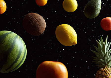 Colorful fruits like watermelon, orange, and avocado floating against a speckled black background