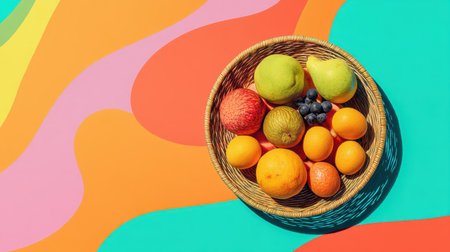 A vibrant display of assorted fresh fruits in a woven basket, set against a colorful abstract background, perfect for health and wellness themes.