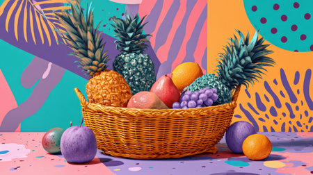 A stunning basket filled with a variety of fruits including pineapples, pears, and grapes, set against a vivid background showcasing lively patterns and vibrant colors.