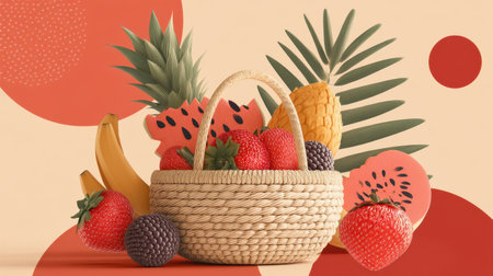 A vibrant fruit arrangement in a woven basket showcases a variety of fresh fruits against a playful geometric background, emphasizing healthy eating and aesthetic appeal.