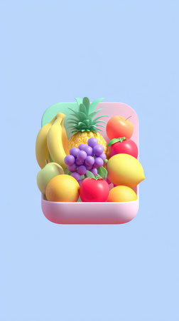 A vibrant display of assorted fresh fruits arranged beautifully in a modern bowl on a pastel background, ideal for healthy lifestyle promotion and culinary inspiration.