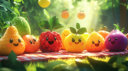A vibrant collection of cheerful cartoon fruits with happy faces, set in a sunny natural environment. Perfect for conveying joy and freshness.