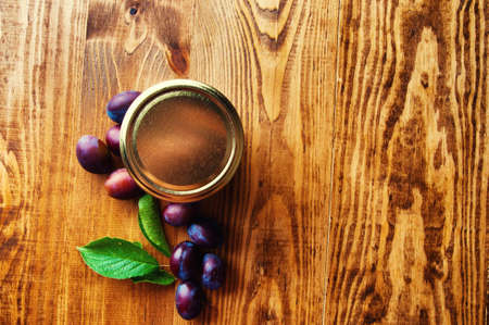 Three homemade canned plum compote in large jars on wooden board. Rustic style.