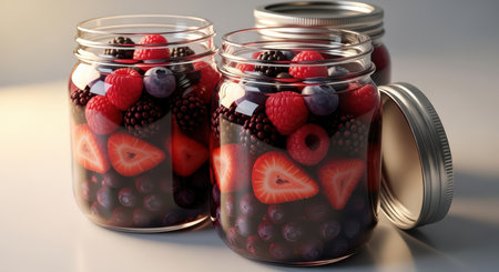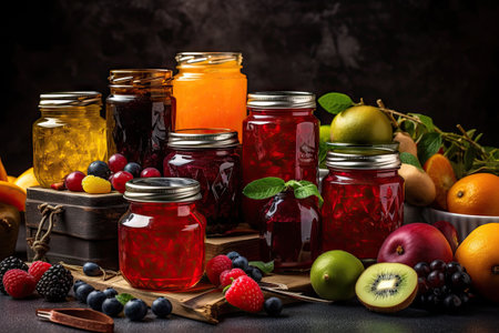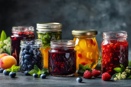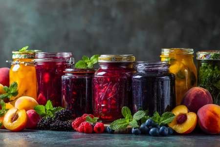 Vibrant glass jars filled with colorful fruit preserves featuring peaches, berries, and fresh mint set against a dark, elegant background.