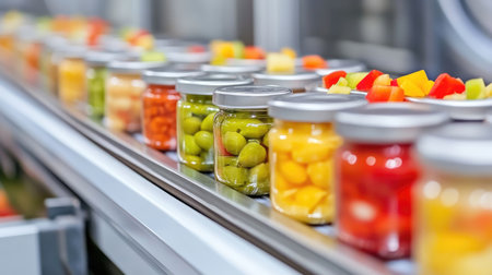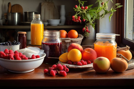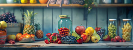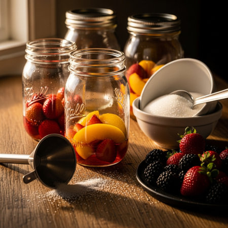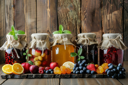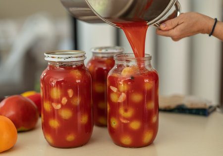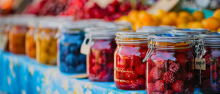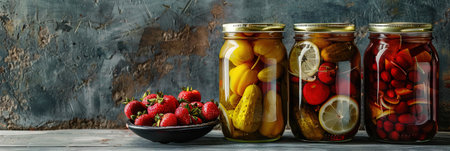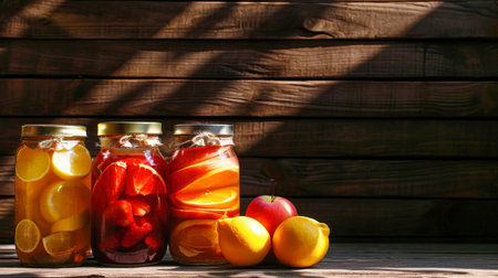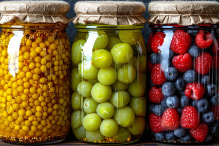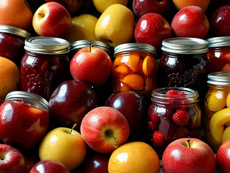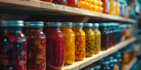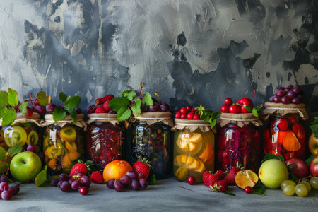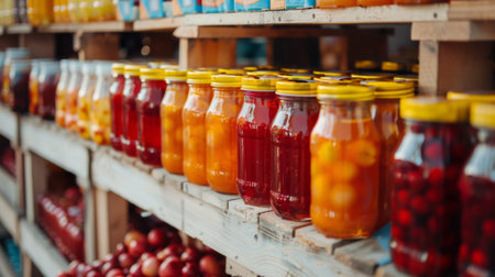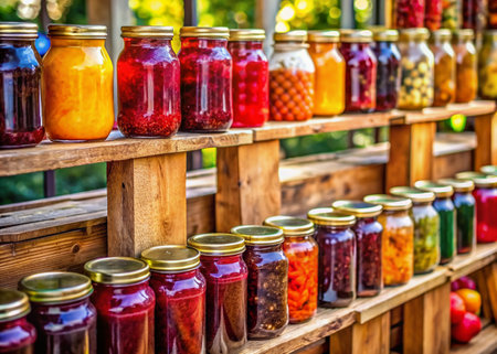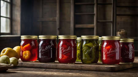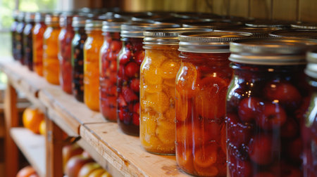 A vibrant arrangement of jars filled with preserved fruits and vegetables showcases the art of canning, bringing warmth and color to a charming kitchen atmosphere.
