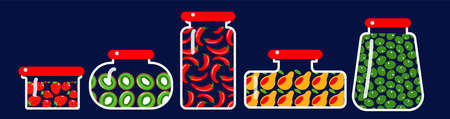 strawberries, chili peppers, pears, kiwis and olives fruits and vegetables in jars background vector illustration