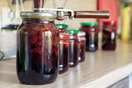 The idea of preserving plum compote for future use in glass jars on a wooden table. Blue plum, capping machine and sugar on the background of finished compote in jars.