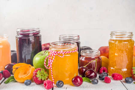 Assortment of berries and fruits jams. Set of various seasonal summer berry and fruit jam, marmalade and confitures. White wooden background copy space