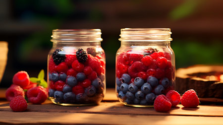 Homemade Fruit and Berry Salads in Jars, Great Idea for Take Away Healthy Snack. Clean or Detox Eating Concept