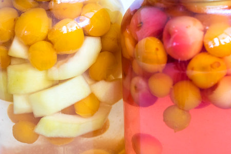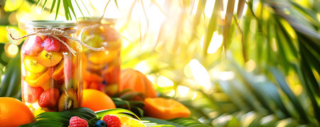 Jars with kompot on table. Sealed glass jars with kompot placed on table near flowers and fruits on summer day in garden.