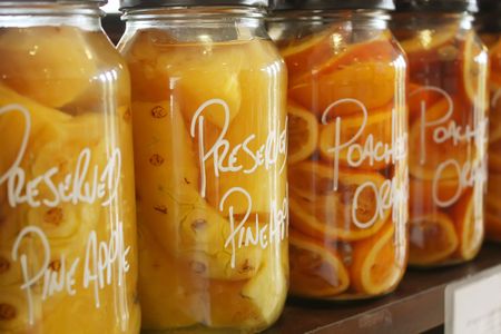Homemade and homegrown fruit and vegetable preserves in jars.