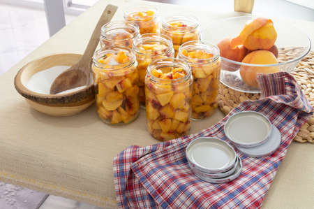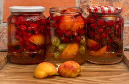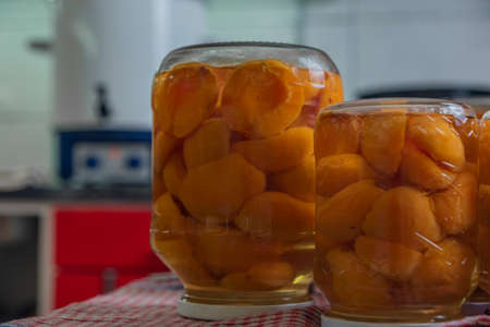 Making of apricot compote on wooden table interior middle of summer in cellar