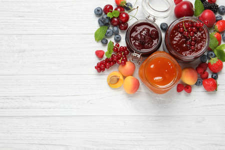 Jars with different jams and fresh fruits on white wooden table, flat lay. Space for text