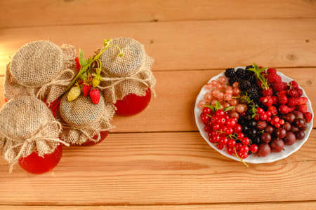 Assorted fresh summer berries and jam in jars. Raspberries, gooseberries, blackberries, currants, wild strawberries, strawberries.