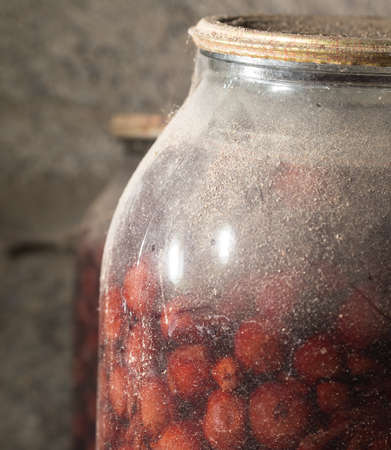 Several cans of compote on a wooden shelf in a dark basement Close up