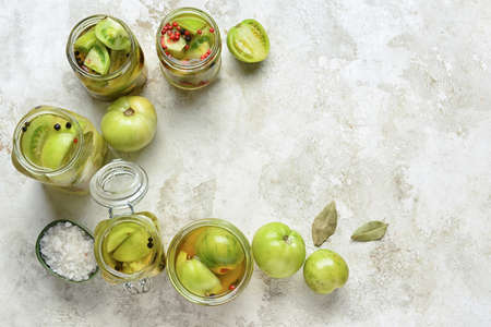 Harvesting vegetables for the winter. Glass jars with pickled red tomatoes.