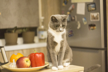 very beautiful and interesting grey cat,young, and healthy,well posing in the photo