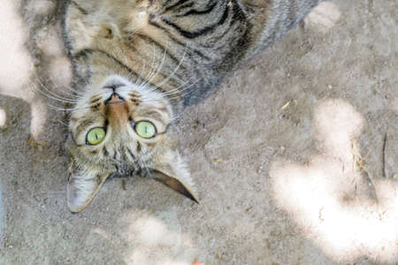 Close-up of a domestic cat with beautiful green eyes lying on the floor.
