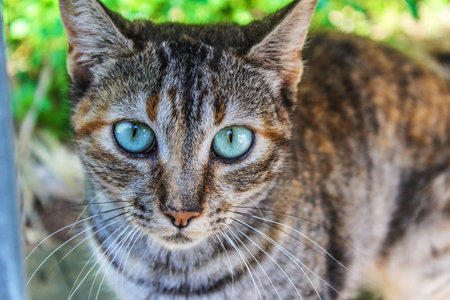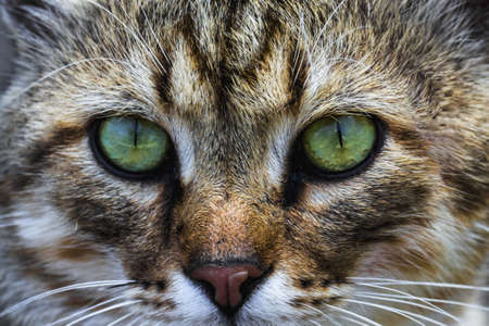 a cat portrait. cat face close up in the street .. cat's nose and eyes, macro view. Curious animal portrait close.