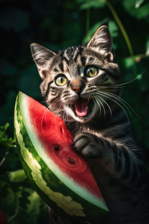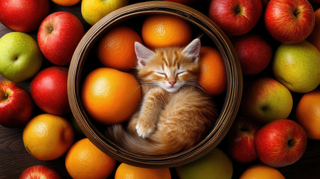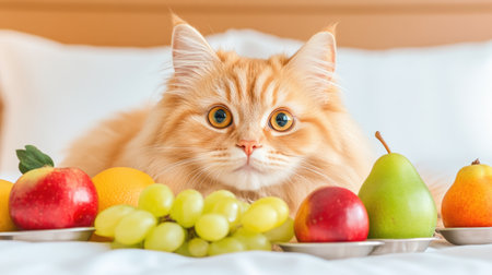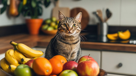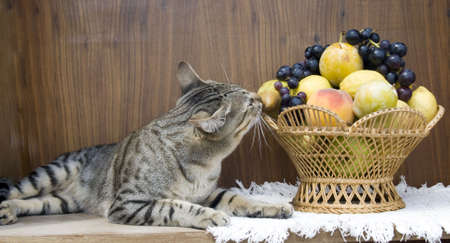 The cat is eating the fruits in vase