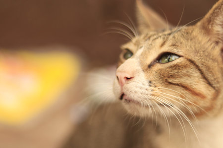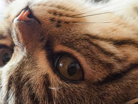 Close up of a cat face. Tabby cat. Felis catus. Side view. Detail background.