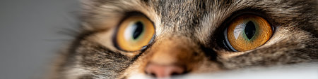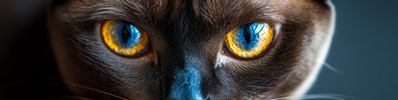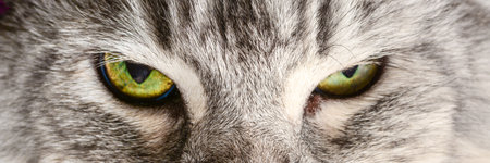 Cats eyes. Maine coon dramatic look straight in camera. Macro close up cat face with yellow green eyes, banner size.