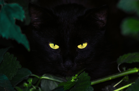 Green eyes black cat in the bushes. The cat creeps on the victim.