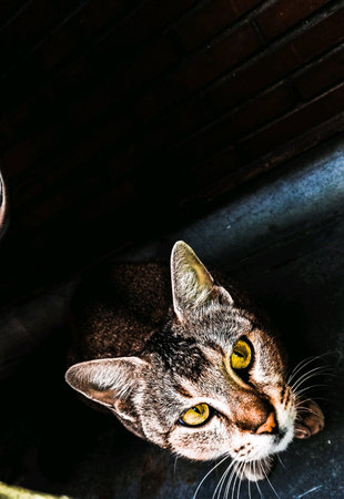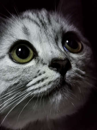 Cat in the dark. Portrait of a Kitty who is looking up on a black background.Suitable for posters,flyers,banner