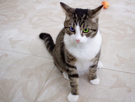 Domestic pet cat with bright multicolored blue and green eyes sits on floor posing and ready to attack