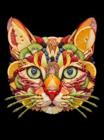 A meticulously crafted cat's head is formed from an intricate arrangement of fresh fruits, vibrant vegetables, assorted cheeses, cured meats, and various nuts.