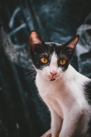 Closeup of a stray cat looking to somewhere over a dark green background. Selective focus. Copy space available
