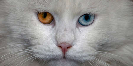 Muzzle of a white cat with multicolored eyes, blue and orange, close-up