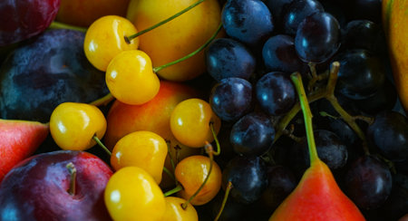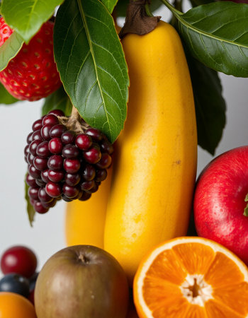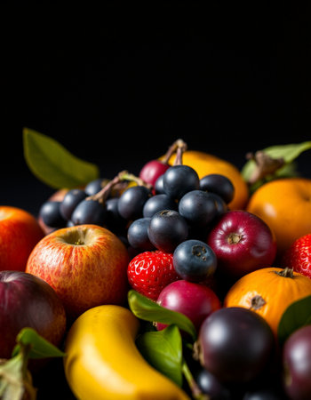 A close up of a variety of fruits including apples, grapes, and strawberries. Concept of abundance and freshness, with the fruits arranged in a visually appealing manner