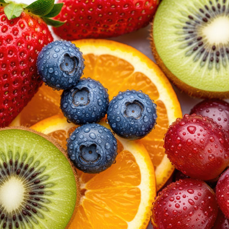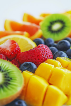 This close-up showcases vibrant, colorful fruits including strawberries, blueberries, kiwi and orange slices. The fruits are arranged to create an appetizing visual, with high-angle lighting emphasizing their textures. This image is suitable for various commercial uses, such as illustrating healthy eating or food-related concepts.