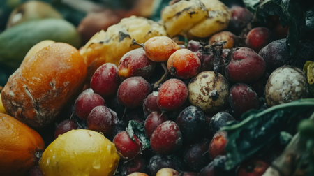 Rotten fruits and vegetables in a pile, with signs of decay, spoilage, and mold, highlighting food waste on a farm or market