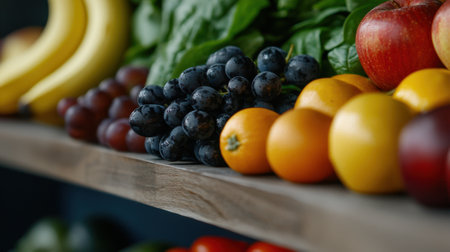 A vibrant collection of fresh fruits and vegetables is arranged neatly on wooden shelves. Bananas, apples, oranges, grapes, and leafy greens combine to create an appealing market display.