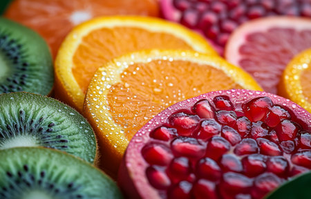 A colorful array of sliced fruits, including kiwi, orange, and pomegranate, glistening with droplets
