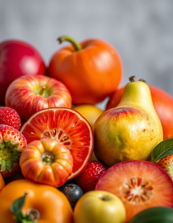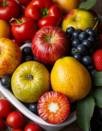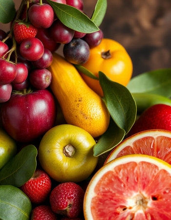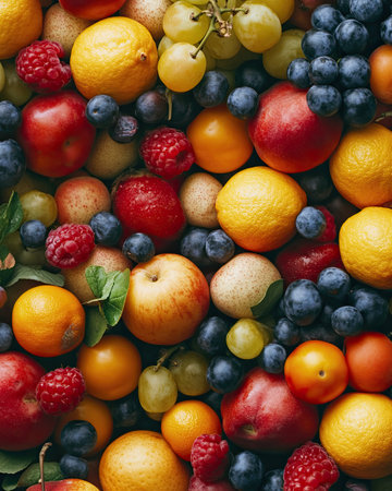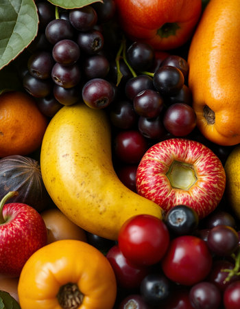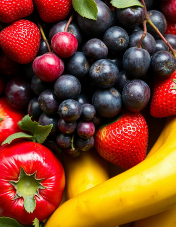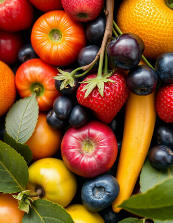 An enticing background featuring a mix of colorful fruits, vegetables, and berries, ideal for promoting healthy eating