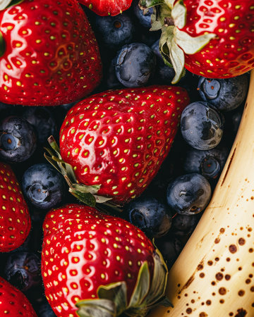 Ingredients for juicy fruit salad close up fresh strawberries, blueberries, and bananas