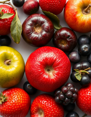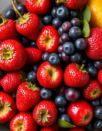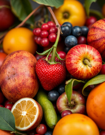 An AI generated illustration of A brightly colored still life of assorted fresh fruits, featuring a blueberry, strawberry, blackberry and apple
